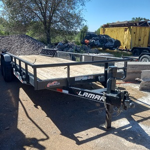 Equipment | Trailer, black with rails and ramps. 20 feet long, tandem axle. Lamar |